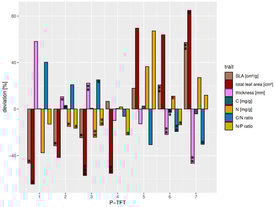 Relative deviation from the average median of dominating functional traits (relation > 0.5 with the OFIs F1 and F2) relevant to productivity for all P-TFTs. Average median values over all P-TFTs are: SLA = 81.5 cm2/g, leaf thickness = 0.32 mm, C = 478.9 mg/g, N = 17.3 mg/g, N/C = 29.7, and N/P = 20.2. Significant differences between the TFT traits and the average TFT median trait are marked corresponding to the p-value < 0.05: *; p-value < 0.01: **; p-value < 0.001: ***. The P-TFT 5 was not tested, as it was only comprised of a single species.