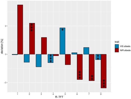 Deviations from average median VIS (blue, <700 nm) and NIR (red, >700 nm) albedos for the R-TFTs 1–8 related to different effects on solar radiation partitioning. Average median values over all R-TFTs were: VIS albedo = 7.4%, NIR albedo = 21.9%. Significant differences between the TFT albedos and the average TFT median albedo are marked corresponding to the p-value < 0.05: *; p-value < 0.01: **; p-value < 0.001: ***. The TFTs R1 and R3 were not tested, as they were only comprised of a single species.