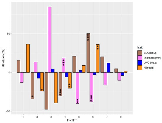 Relative deviations from the average median of selected structural and biochemical functional traits (correlation > 0.5 with OFIs F1–4) relevant for solar radiation partitioning over all R-TFTs 1–8. Average median values over all R-TFTs were: SLA = 83.0 cm2/g, leaf thickness = 0.32 mm, N = 17.3 mg/g, and leaf water content (LWC) = 642.8 mg/g. Significant differences between the TFT traits and the average TFT median trait are marked corresponding to the p-value < 0.05: *; p-value < 0.01: **; p-value < 0.001: ***. The TFTs R1 and R3 were not tested, as they were only comprised of a single species.