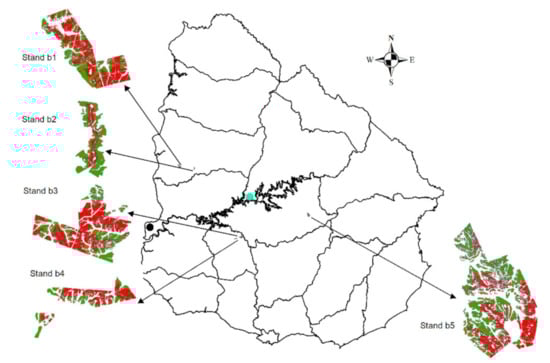 The study area comprised about 1882 ha of Eucalyptus grandis and Eucalyptus dunnii plantations owned by Forestal Oriental SA in Uruguay. Figure 1 shows the five sites included in the study: sites b1 and b2 with 861 ha (43° 13′ 97″ S–64° 24′ 78″ W, hereafter Guichon); sites b3 and b4 with 870 ha (63° 07′ 44″ S–52° 22′ 64″ W, hereafter Trinidad), and site b5 with 717 ha (63° 44′ 33.05″ S–63° 95′58″ W, hereafter Sarandí del Yi). Climate is subtropical, with a mean annual temperature of 18 °C (12 °C in the coldest month, 24 °C in the warmest month) and a mean annual rainfall between 1300 and 1400 mm [28]. According to the National Commission for Agroeconomic Studies of the Land classification (CONEAT), the predominant soil in Guichon is planosols with a horizon A of 40–50 cm depth, characterized by low fertility, weak structure, low level of organic matter, slopes of 1–3%, sandy texture, medium to low risk of drought, imperfect drainage, moderately-slow to slow permeability, and good rooting ability. Soils in Trinidad are vertisols with a horizon A of 50–60 cm, and characterized by medium fertility, weak structure, medium level of organic matter, slopes of 2–5%, loam franc structure, low risk of drought, moderate drainage, moderately permeability, and good rooting ability. Soils in Sarandí del Yi correspond to vertisols, rupticos, and brunosols, with a horizon A of 50–60 cm depth and characterized by sandy-loam, loam franc texture, low fertility, low risk of erosion, moderate slopes (1–3%), weak structure, low organic matter, imperfect drainage, and good rooting capacity.