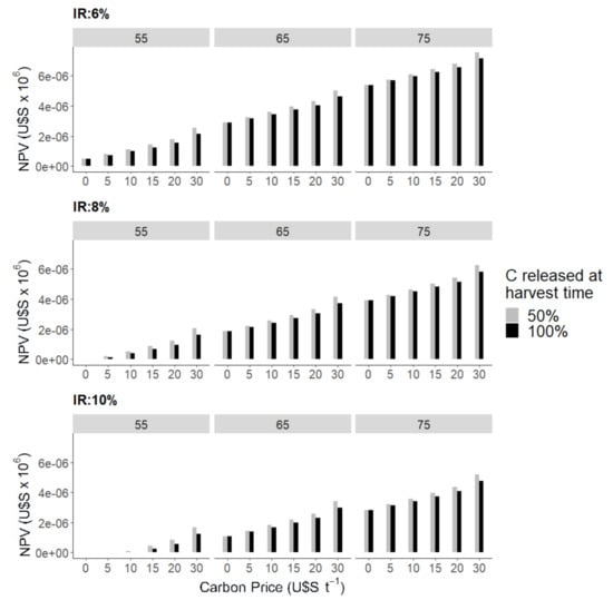 Figure 2 shows the relationship between NPV and C price for the range of IRs, timber prices, and C release approaches (50 or 100% of C released at the harvest time) included in the study. As expected, in SC2 scenarios, NPV was sensitive to C prices and IR. There was a clear relationship between NPV and C price, with NPVs that, on average, increased at a rate of 0.55 (IR = 6%), 1.38 (IR = 8%), and 1.61 M USD (IR = 10%) for every 5 USD t−1 rise in C price. The maximum NPV among all the scenarios evaluated (2.52 M USD) was calculated for a C price of 30 USD t−1, an IR of 6% and a timber price of 75 USD m−3. In addition, there was a substantial reduction in NVP when the IR increased from 6 to 10%. For example, for a C price of 15 USD t−1, a timber price of 65 USD m−3, and a 100% C release approach, the NVP was 3.75, 2.73, and 1.99 M USD for an IR of 6, 8, and 10%, respectively. The differences in NPV between the three IRs were statistically significant at p ≤ 0.05. For SC2 scenarios that included an IR of 8 and 10%, and a timber price of 55 USD t−1, NPVs became positive only after a minimum C price. For an IR of 8%, this minimum C price was 5 USD m−3 irrespective of the C release approach being used. For an IR of 10%, the minimum price was 10 USD m−3 for a 50% C release approach, and 15 USD m−3 for a 100% C release approach.