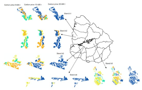 Our results reveal that the spatial arrangement and number of stands to be harvested in each period were sensitive to C prices. With low C prices (0 and 5 USD t−1), the model aimed to maximize NPV and returns from the sale of timber, which resulted in the harvesting of a large proportion of stands in periods 7 and 8; these stands were associated with lower harvesting and transport costs due to their yield per ha and distance to the pulp mills. On the contrary, with high C prices (20 and 30 USD t−1), the model aimed to maximize NPV and returns from C sequestration, which resulted in longer harvest ages (9 and 10 years) and in a large proportion of stands that reached high yields per ha in these periods.