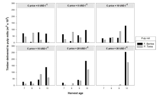 The spatial distribution of the stands being harvested per period (Figure 3) was impacted by harvest age, C and timber prices, and IR. Spatially arranged harvest of stands aimed to minimize harvest and transport costs, and maximize returns from timber and C, thereby maximizing NPV. This also had an impact on the flow of timber being delivered from stands to customers (Figure 4). In the case of SC2 scenarios, the peak flow of timber from stands to P. Toros pulp mill occurred at longer harvest ages when C price increased from 5 to 30 USD t−1, reaching a maximum volume (174,289 m3) in period 10 when C price equaled 30 USD t−1. On the contrary, in SC1 scenarios, the maximum flow of timber to P. Toros pulp mill occurred during periods 7 and 8, reaching a maximum of 73,807 m3 in year 8. Regarding timber flows to F. Bentos pulp mill in SC2 scenarios, maximum volumes of 96,529, 129,289, 138,632, 186,163, and 255,142 m3, were obtained in year 10 for C prices of 5, 10, 15, 20, and 30 USD t−1, respectively. In SC1 scenarios, the maximum volume delivered to F. Bentos pulp mill (78,889 m3) was obtained in period 9. In all scenarios that included a C price lower than or equal to 15 USD t−1, there was a positive volume of timber delivered to F. Bentos pulp mill. For scenarios that included a C price of 20 USD t−1, there was no timber flow to F. Bento from coupes being harvested in period 8. The same occurred in periods 7, 8, and 9 for a C price of 30 USD t−1. At this C price, no timber was delivered to any pulp mills since no forest stands were harvested in these periods.