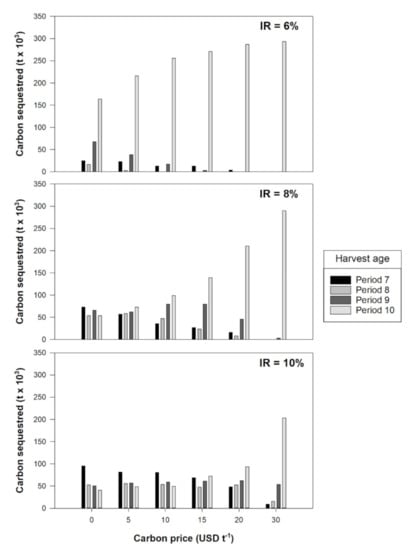 As observed in Figure 5, both the total and per period C sequestered were shown to be very sensitive to C prices, and highly affected by the harvest age. In all scenarios, the maximum amount of C sequestered occurred in period 10 for a C price of 30 USD t−1. At this C price, most stands were harvested in period 10 to maximize revenue from C credits; amounts of C sequestered totaled 293,196 t for an IR of 6%, 289,196 t for an IR of 8%, and 203,586 t for an IR of 10%. The amount of C sequestered in period 10 declined with lower C prices, which was more evident in scenarios with an IR of 8 and 10%. In the latter case, the C sequestered dropped by 53.9% when C price was reduced from 30 to 20 USD t−1. With an IR of 6%, the C sequestered declined gradually when C price was reduced from 30 to 0 USD t−1. Likewise, when passing from 30 to 10 USD t−1, the drop in C sequestered occurred at an average rate of 9295 t per every 5 USD t−1 reduction in C price, while when passing from 10 to 0 USD t−1, the drop was about 46,145 t per every 5 USD t−1 reduction in C sequestered.