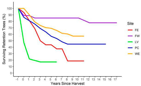 Post-harvest attrition of retained whitebark pine according to harvest site (FE: Findlay East; FW: Findlay West; LV: Lavington; PC: Paturages; WE: West Elk).