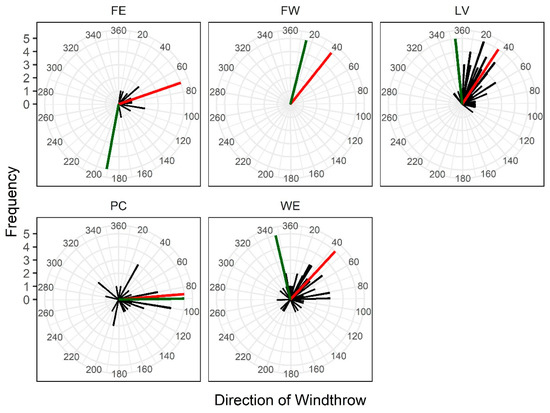 Circular histograms of windthrown trees at five harvest sites. Black bars: frequency of trees oriented at the respective azimuth. Red bars: mean azimuth of windthrow orientation. Green bars: mean azimuth of slope aspects as measured at the base of each stem. All FW tree bars match mean windthrow azimuth. (FE: Findlay East; FW: Findlay West; LV: Lavington; PC: Paturages; WE: West Elk).