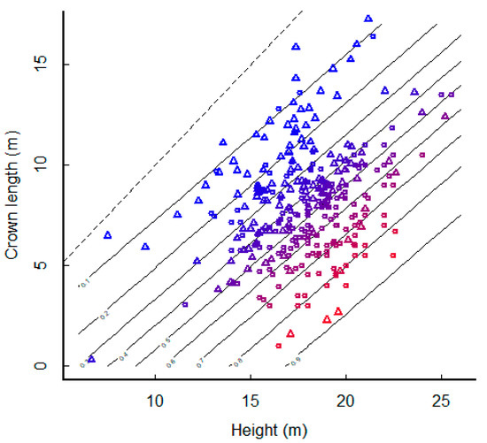 Probability of mortality (symbol colour, from blue = low to red = high) as a function of tree height and crown length. Labelled contour lines also show the probability at each combination of crown length and height. Each point is a measured stem: squares = dead, triangles = live. All other variables are held at their mean values.