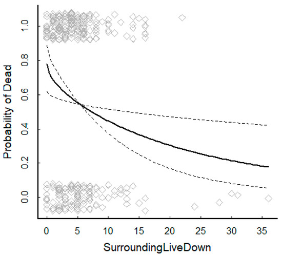 Relationship between probability of mortality of a tree and the number of surrounding live or downed trees. Points are individual trees that either died (top of axis) or remained alive (bottom of axis). Dashed lines are 90% confidence intervals on the relationship. All other variables are held at their mean values.