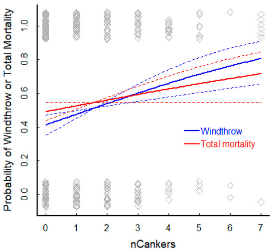 The number of cankers and the presence of rodent wounds affected tree survivorship (Table 4). Interestingly, there were opposite effects depending on the lesion type. As the number of cankers increased, the probability of post-harvest survivorship decreased. Although rodent wounds were not tallied, any rodent damage indicated higher survivorship. The canker association was included in the best model for windthrown trees but not when snags were included. The average pre-harvest canker-free tree would have a 50–60% chance of survival (Figure 6). With one or more cankers, there would be less than a 50% chance of survival.