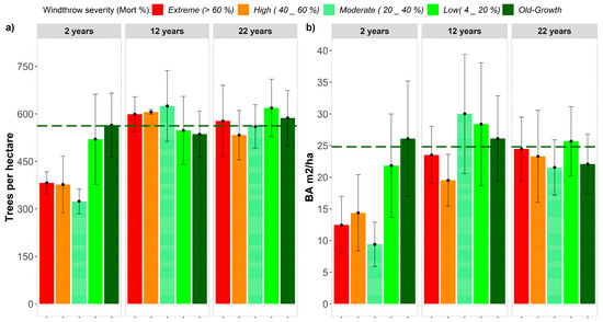 Recovery of (a) tree density (N tree ha−1), and (b) mean basal area (m2 ha−1) of old-growth and windthrown forests across the range of severity classes at 2, 12, and 22 years after windthrow. 95% confidence intervals given by the error bars. Dashed dark green lines show the old-growth mean (of the three sites).