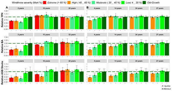 In the Amazon, windthrow distribution extends from the Northwestern Amazon to the Central Amazon [12], showing a spatial and temporal variability in gap sizes [11,65] and mortality rates [6,8,9,12]. In our study, the estimated time to recover AGB increased slightly with windthrow severity. In our study, the recovery to old-growth levels occurred after 22 years (Figure 3A, bottom panel), whereas in the Central Amazon, 24 years were only enough to recover the old-growth levels of attributes observed in forests exposed to low-severity windthrow, and showed a slower growth increment for moderate and high severities even 27 years after windthrow (Figure 3B, bottom panel).