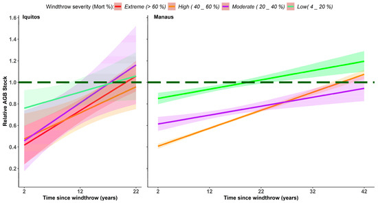 Extreme disturbance (>60% mortality) reduced the mean AGB to 163 ± 68 Mg ha−1 (2 years after windthrow). AGB increased to 323.4 ± 138.7 Mg ha−1 and 327.5 ± 86.2 Mg ha−1, 12 and 22 years after disturbance, respectively. This AGB recovery process was also observed for sites with high severity. Although AGB loss was considerably lower at low and moderate severity, these areas showed an increased biomass compared to old-growth levels 12 years after windthrow. AGB values differed among studied old-growth areas (see details in Appendix C). For these reasons, AGB recovery in disturbed areas was analyzed relative to old-growth values. Thus, a relative sequence of AGB recovery was made (Figure 3A, bottom panel). As suggested by a linear model (Figure 4-Iquitos), AGB stocks at all windthrow severities will recover to ~90% of that observed in contiguous old-growth forest over a time span of 22 years.