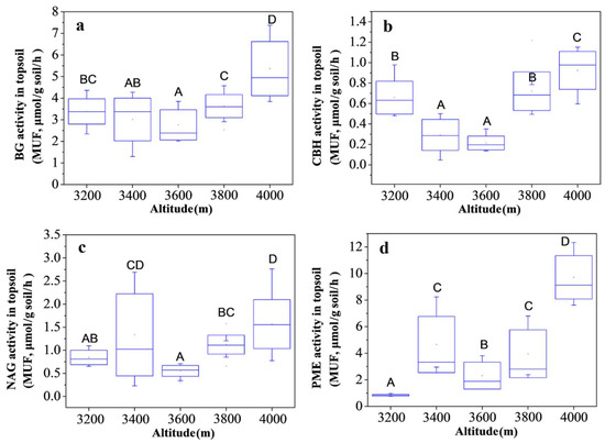 Soil enzyme activity in the topsoil (0–10 cm) along the altitudinal gradient of Mengbi Mountain: (a) BG = β-glucosidase, (b) CBH = cellobiohydrolase, (c) NAG = β-N-acetyl-glucosaminidase, and (d) PME = phosphomonoesterase. Different capital letters indicate significant (p < 0.05) differences at different altitudes in one-way analysis of variance (ANOVA) based on Duncan’s comparison procedure (the same in Figure 2).