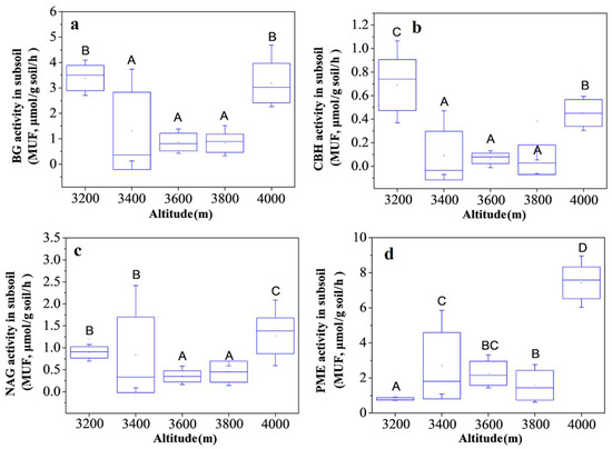 Soil enzyme activity in the subsoil (10–20 cm) along the altitudinal gradient of Mengbi Mountain: (a) BG = β-glucosidase, (b) CBH = cellobiohydrolase, (c) NAG = β-N-acetyl-glucosaminidase, and (d) PME = phosphomonoesterase.