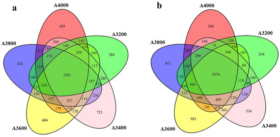The Venn diagrams (Figure 3) showed that the number of OTUs shared among the five altitudes was 2501 in the topsoil (accounting for 42.8%–46.8%) and 2,076 in the subsoil (accounting for 36.9%–44.6%). In the topsoil, the proportion of specific OTUs (only appearing at a given altitude) was highest at A3400 (12.4%), followed by A3600 (9.1%), A3800 (7.8%), A4000 (7.7%), and A3200 (7.0%). In the subsoil, the proportion of specific OTUs was highest at A3200 (11.6%), followed by A3600 (10.7%), A3400 (10.7%), A4000 (9.8%), and A3800 (7.9%). Sample clustering (Figure 4) based on the Bray–Curtis distance indicated that the soils at the same altitude were more analogous than the soils from the same soil layer. The soils from different layers at A3400, A3600 and A3800 clustered together. However, the distances between the topsoil and the subsoil at A3200 and A4000 were relatively large, indicating differences in microbial composition.