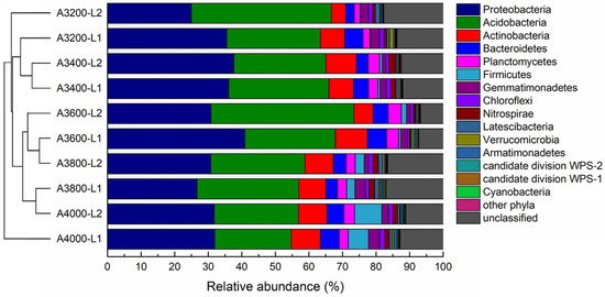 At the phylum level, the dominant phyla among all of the soil samples were Proteobacteria (32.7%), Acidobacteria (30.2%) and Actinobacteria (7.7%), followed by Bacteroidetes (4.4%), Planctomycetes (2.9%), Firmicutes (2.3%), Gemmatimonadetes (2.0%), Chloroflexi, (1.2%), and Nitrospirae (1.2%). The sum of the relative abundances of other identified phyla was 2.5%, and the remaining 12.8% was unclassified. Two-way ANOVA showed that soil depth had significant (p < 0.05) impacts on the relative abundances of Gemmatimonadetes and Verrucomicrobia, and altitude had significant (p < 0.05) impacts on the relative abundances of Planctomycetes, Firmicutes, Gemmatimonadetes, Nitrospirae, Latescibacteria and Armatimonadetes.