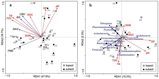 The transformation of soil nutrients and microbial metabolism showed different patterns with soil depth [55,56,57]. In our study, soil nutrients (TOC, TN, DOC, DON and DP) and enzyme activities (BG, CBH, NAG and PME) in the topsoil were significantly higher than those in the subsoil, which is consistent with previous studies in other areas [55,58]. This was presumably because unfavorable soil temperature, nutrient availability and oxygen content limit the accumulation of nutrients and enzymatic reactions in the subsoil.