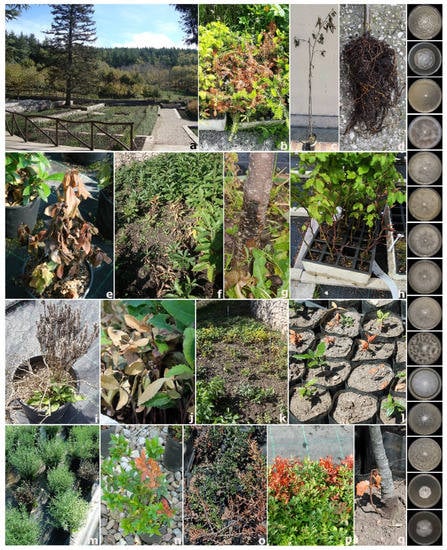 Overview of the forest nursery N1 (a), symptoms of wilting, sudden death and collar and root rot observed on: Abies alba (b), Alnus incana (c,d), Arbutus unedo (e), Castanea sativa (f,g), Fagus sylvatica (h), Helichrysum italicum (i), Ilex aquifolium (j), Juglans regia (k), Laurus nobilis (l), Lavandula officinalis (m), Myrtus communis (n), Phyllirea latifolia (o), Pistacia lentiscus (p) and Quercus ilex (q) seedlings. On the right from the top, colony morphology of: Phytophthora acerina, P. bilorbang, P. cactorum, P. cinnamomi, P. citrophthora, P. mediterranea, P. megasperma, P. nicotianae, P. palmivora, P. parvispora, P. pistaciae, P. plurivora, P. pseudocryptogea, P. pseudosyringae and P. psychrophila after 7 days growth at 25 °C on CA in the dark.