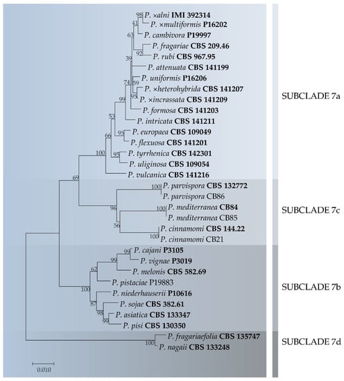 Maximum likelihood tree obtained from combined ITS, Btub and cox1 sequences of Phytophthora species belonging to clade 7. Data are based on the general time reversible model. A discrete gamma distribution was used to model evolutionary rate differences among sites. The tree is drawn to scale, with branch lengths measured in the number of substitutions per site. Bootstrap support values in percentage (1000 replicates) are given at the nodes. Ex-type cultures are reported in bold.