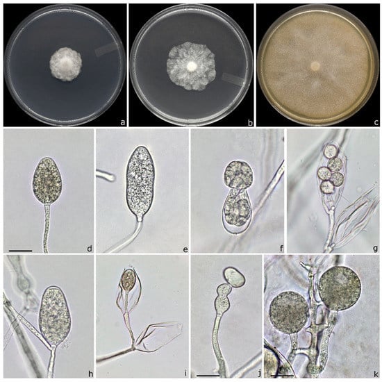 Description: sporangia were abundantly produced in unsterile pond water after 36–48 h of incubation at 20 °C. They were non-papillate, rarely semi-papillate, persistent, from ovoid to ellipsoid and less frequently elongated or distorted (Figure 3d,e,h). Typically, sporangia were borne terminally on unbranched sporangiophores and only occasionally on compound sporangiophores. Sporangial proliferation was usually external and very rarely internal (nested and extended) (Figure 3g–i).