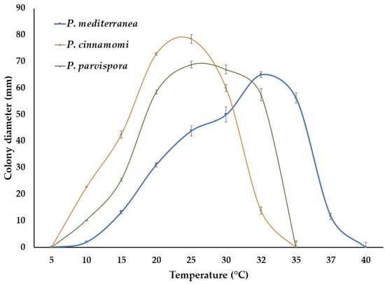 Mean colony diameter (± standard deviation) of P. cinnamomi (CB21), P. mediterranea (CB84) and P. parvispora (CB86) after 96 h on CA in the dark at different temperatures.