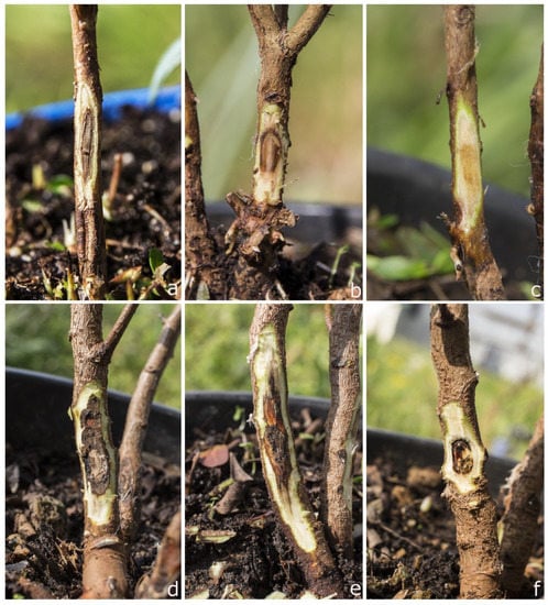 All inoculated seedlings were kept in a climatic chamber at 25 °C and watered every two days until the end of the experimental period. After 20 days, all plants were checked for the presence of disease symptoms and the length of necrotic lesion surrounding the inoculation site was measured after removing the outer bark with a sterile scalpel.