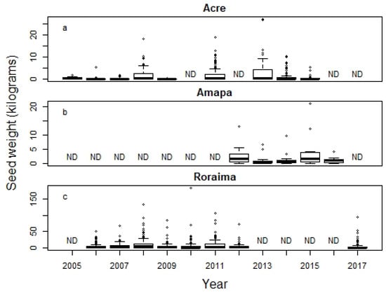 Boxplots of Carapa guianensis seed production (kilograms) by year are shown for the three study regions in the Brazilian Amazon: (a) Acre, (b) Amapá, and (c) Roraima. ND indicate years for which no data were collected at a specific site.