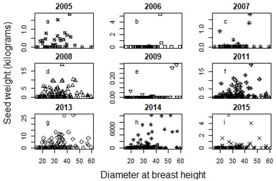 Annual seed production (kilograms) by Carapa guianensis diameter at breast height in Acre Brazil in (a) 2005; (b) 2006; (c) 2007; (d) 2008; (e) 2009; (f) 2011; (g) 2013; (h) 2014; and (i) 2015..