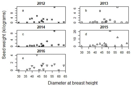Annual seed production (grams) by Carapa guianensis diameter at breast height in Amapá, Brazil in (a) 2012; (b) 2013; (c) 2014; (d) 2015; and (e) 2016.