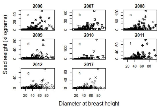Annual seed production (kilograms) by Carapa guianensis diameter at breast height in Roraima, Brazil in (a) 2006; (b) 2007; (c) 2008; (d) 2009; (e) 2010; (f) 2011; (g) 2012; and (h) 2017.