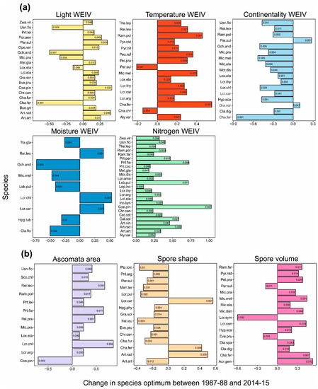 Significant (p < 0.05) changes in species’ optima for the abiotic environmental gradients (calculated based on Wirth’s ecological indicator values) of light, temperature, continentality, moisture, and nitrogen (a) and biotic environmental gradients (calculated based on lichen functional traits) of ascomata area, ascospore volume, and ascospore shape (b). Numbers in bars represent the size of the change in species optimum. For full species names, see Table S1 in the Supplementary Materials.