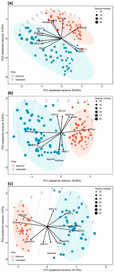 Results of PCA ordinations performed for the lichen species composition sampled during 1987–1989 and resampled during 2014–2015 on plots representing coniferous (a), mixed deciduous (b), and wet forest communities (c). Points represent plots; size of points represents plot species richness, grey isolines represent the Shannon index, and arrows represent lichen biota composition characteristics significantly (p < 0.05) correlated with the ordinations results: FRic—functional richness; FDiv—functional divergence; FDis—functional dispersion; FEve—functional evenness; AscArea—CWM (community-weighted mean) of ascomata area; SporShp—CWM of ascospore shape; SporVol—CWM of ascospore volume; WEIV.L—CWM of light WEIV (Wirth ecological indicator value); WEIV.T—CWM of temperature WEIV; WEIV.C—CWM of continentality WEIV; WEIV.M—CWM of moisture WEIV; WEIV.N—CWM of nitrogen WEIV.