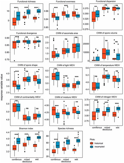 Comparison of the changes in parameters of functional diversity (functional richness, evenness, dispersion, and divergence) and CWMs (community-weighted means) of lichen functional traits (ascomata area, ascospore shape, and ascospore volume), CWMs of Wirth’s ecological indicator values (light, temperature, continentality, moisture, and nitrogen) and parameters of taxonomical diversity (species richness and Shannon index) between the two periods of lichen sampling (1987–1989 and 2014–2015) were obtained for coniferous, mixed deciduous, and wet forests using linear mixed effect regression. The box covers the 95% confidence range. The thick horizontal line is the median. Black points are outliers. Significance of results: *** p < 0.001, ** p < 0.01, * p < 0.05, n.s.—not significant.