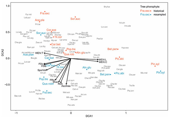 Results of DCA ordination performed for the lichen species composition sampled during 1987–1989 and resampled during 2014–2015 regarding tree phorophytes. Points represent tree phorophytes: Ace.pla—Acer platanoides; Aln.glu—Alnus glutionosa; Bet.pen—Betula pendula; Car.bet—Carpinus betulus; Cor.ave—Corylus avellana; Fra.exc—Fraxinus excelsior; Pop.tre—Populus tremula; Pic.abi—Picea abies; Pin.syl—Pinus sylvestris; Que.rob—Quercus robur; Sor.auc—Sorbis aucuparia; Til.cor—Tilia cordata. Lichen species are marked in grey (for full species names see Table S1). Arrows represent lichen biota composition characteristics significantly (p < 0.05) correlated with the ordinations results: FRic—functional richness; FDiv—functional divergence; FDis—functional dispersion; AscArea—CWM (community-weighted mean) of ascomata area; SporVol—CWM of ascospore volume; WEIV.L—CWM of light WEIV (Wirth ecological indicator value); WEIV.T—CWM of temperature WEIV; WEIV.C—CWM of continentality WEIV; Rich—species richness; Shan—Shannon index.