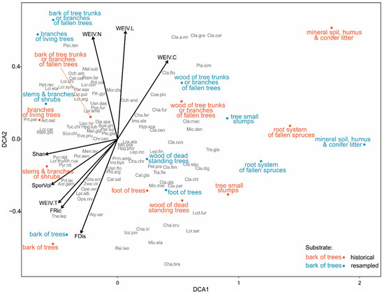 Results of DCA ordination performed for the lichen species composition sampled during 1987–1989 and resampled during 2014–2015 regarding substrates. Points represent substrates. Lichen species are marked in grey (for full species names, see Table S1). Arrows represent lichen biota composition characteristics significantly (p < 0.05) correlated with the ordinations results: FRic—functional richness; FDis—functional dispersion; SporVol—CWM (community weighted mean) of ascospore volume; WEIV.L—CWM of light WEIV (Wirth ecological indicator value); WEIV.T—CWM of temperature WEIV; WEIV.C—CWM of continentality WEIV; Shan—Shannon index.