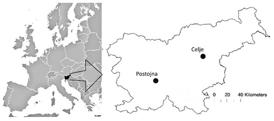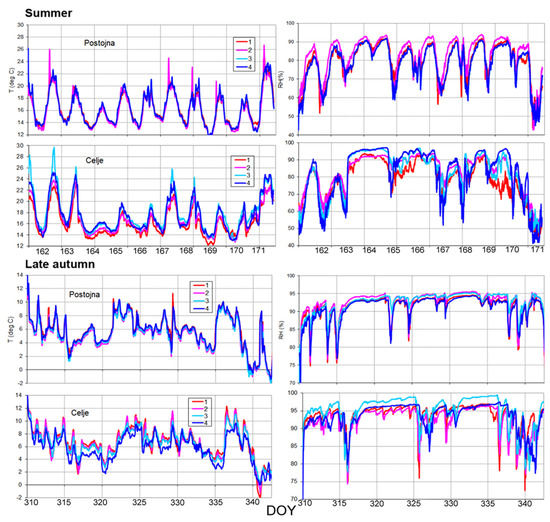 In summer and late autumn, the average values of temperature and RH (%) were higher in Celje than in Postojna. The detailed values are presented in Table 3.