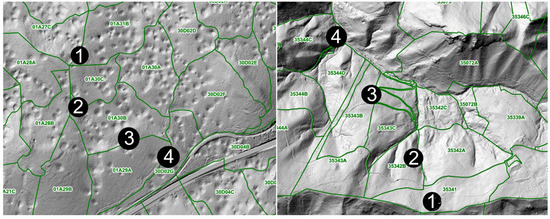 Location of micrometeorological stations, arranged from the locally highest (1) to the lowest (4) elevation at the Postojna (left) and Celje (right) research sites (M = 1:1000; source: Slovenia Forest Service).