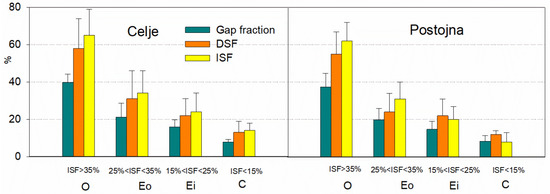 Differences in light parameters (GF%, DSF%, ISF%), Ntot, A, and Φ in equal light categories between two selected sites were tested with factorial analyses of variance (ANOVA) after normality test and homogeneity of variances using the Statistica software system (2011). No transformation of the data was required to meet the criteria of normality in all tested parameters. Probability values of p < 0.05 (*), p < 0.01 (**) and p < 0.001 (***) were considered significant.