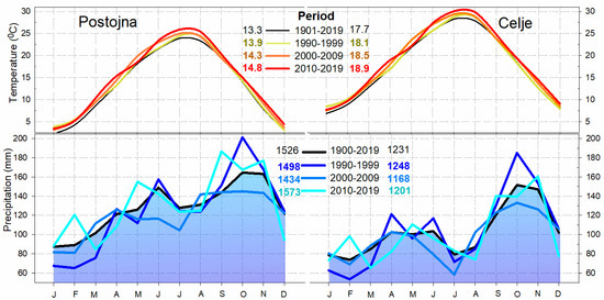 The average cumulative precipitation was higher in Postojna, while average air temperatures were higher in Celje for both long-term (1900–2019) and shorter, 10-year periods (Figure 3). Similar dynamics of changing parameters can be observed at both sites—an increase in average temperatures in the first four months (January–April) and midsummer (July–August), and increased precipitation redistribution, during the last three decades compared to long-term average conditions (Figure 4).