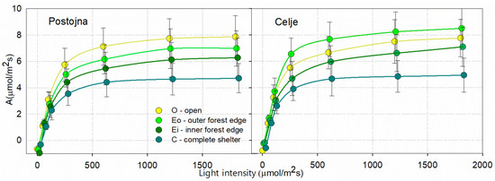 In Postojna, as expected, the assimilation rate (A) was highest in the open (O), followed by the outer forest edge (Eo), inner forest edge (Ei), and lowest under the complete canopy closure (C). In Celje, the response was different: the assimilation rate was highest in the of outer forest edge category (Eo), followed by the open category (O), the inner forest edge (Ei), and complete shelter (C). Absolute values in all comparable categories, except in the open without shelter (O), were highest in all cases in Celje (Figure 6). Responses between different years were similar, without significant differences.