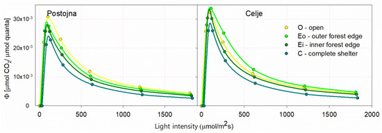 Assimilation response (A) was measured during the main growing season in June and July for three consecutive years (2018–2020) from 7–11:30 a.m. during measurement campaigns. Trees measured were of comparable age (10–15 years) and size; in each light category at least 8 randomly selected trees were measured in the upper third of the crown each year using the LI-6400 portable infrared gas analyzer (IRGA) (Lincoln, NE, USA) with an autonomous light source under constant and computer-controlled environmental conditions. Net assimilation (A) rate in young trees to different light intensities and under comparable light conditions was measured at a constant temperature of the measurement block (20 °C), a CO2 concentration of 400 µmol/mol, a flux of 500 µmol/s, and different light intensities: 0, 50, 100, 250, 600, 1200 and 1800 µmol/m2s. All assimilation values were recorded after being held constant for 2 min or until the coefficient of variation (CV%) fell below 5%. Light use efficiency (Φ), defined as the amount of CO2 fixed per amount of light quanta absorbed (slope of the initial linear part of the light response curve) was determined for each light category (O, Eo, Ei and C) [25].