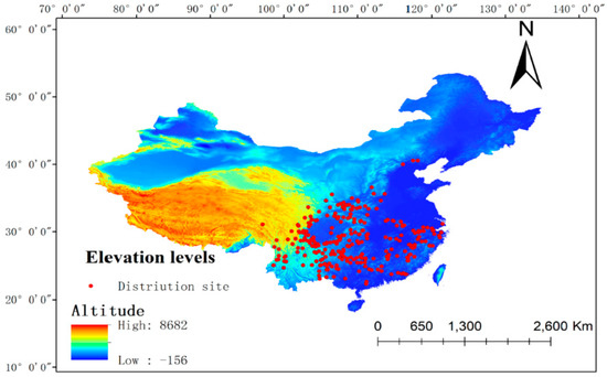 Geographical information of A. davidii: We obtained a total of 287 occurrences of A. davidii by field works or from the China Digital Plant Museum (http://www.cvh.org.cn) and GBIF Database (http://www.gbif.org/) at January 2021. After examination, uncertain and repeated sample points were removed. In total, 262 distribution points, which can be used to perform the MaxEnt model program, were retained, and ArcGIS10.7 was used to draw the geographical distribution map (Figure 1) of A. davidii. The elevation data were downloaded from the National basic Geographic Information Center (http://www.ngcc.cn/ngcc/) at January 2021.