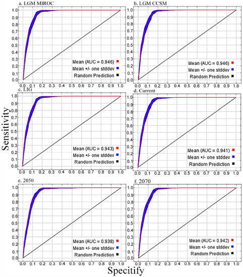 Using 262 contemporary distribution records and 6 climate variables, the maximum entropy model was used to simulate the potential geographical distribution of A. davidii. As shown in Figure 2, in the Last Glacial Maximum (LGM), Last Interglacial (LIG), current and future (2050 and 2070) simulations, the values of AUC were all greater than 0.93, indicating that the prediction results were accurate. We chose MIROC to simulate our data.