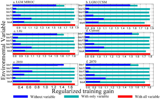 As shown in Figure 3, in the regularization training gain, the proportion of environmental factors in the Last Glacial Maximum, the Last Interglacial, contemporary and 2070 simulations were the same from high to low as the mean temperature of the coldest quarter, precipitation of the warmest quarter, temperature seasonality, precipitation of the wettest quarter, annual precipitation, and precipitation of the wettest month. The proportion of environmental factors from high to low in 2050 was a mean temperature of the coldest quarter, temperature seasonality, precipitation of the wettest month, precipitation of the wettest quarter, annual precipitation, and precipitation of the warmest quarter.