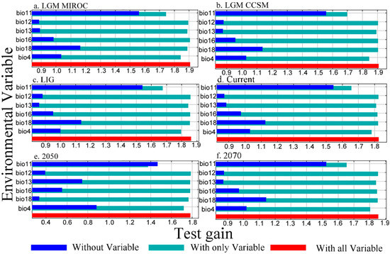 As shown in Figure 4, in the test training gain, the proportion of MIROC in the Last Glacial Maximum was the same as that of contemporary environmental factors, and the contribution rate of this period was the mean temperature of the coldest quarter, precipitation of the warmest quarter, temperature seasonality, precipitation of the wettest quarter, precipitation of the wettest month, and annual precipitation. The proportion of environmental factors in the last glacial maximum (CCSM) and sub-interglacial (LIG) was the same as that in 2070, and the order from high to low was the mean temperature of the coldest quarter, precipitation of the warmest quarter, temperature seasonality, precipitation of the wettest quarter, annual precipitation, and precipitation of the wettest month. The proportion of environmental factors from high to low in 2050 was the mean temperature of the coldest quarter, temperature seasonality, precipitation of the wettest month, precipitation of the wettest quarter, annual precipitation, and precipitation of the warmest quarter.