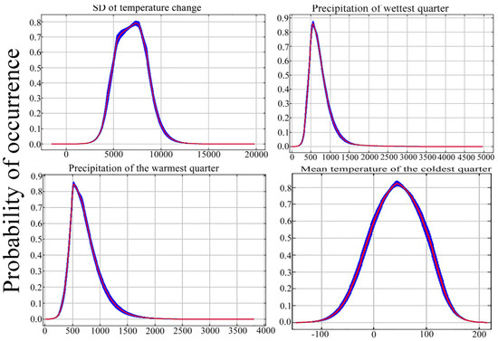 The analyses of those response curves (Figure 5) also indicated how the logistic prediction for A. davidii changed. It indicated that the threshold values of SD of temperature change was 2310 and 12,560, precipitation of the wettest quarter was 195 and 2000 mm, precipitation of the warmest quarter was 190 and 30,250 mm, and mean temperature of the coldest quarter was 110 and 210 °C. The highest points of the images represent their optimal threshold, which means that the temperature or humidity is most suitable for A. davidii to grow.