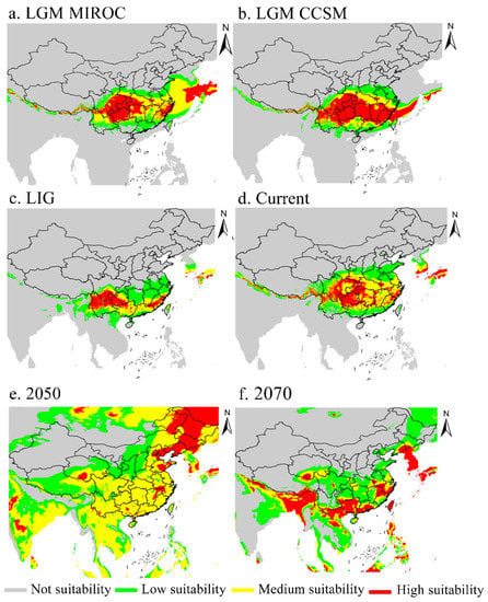According to Figure 6, during the last glacial maximum, the suitable areas were mainly concentrated in the vicinity of latitude 30 °N, and the high-adaptive areas were mainly distributed in Sichuan, Guizhou, and Zhejiang, China, and near the junction of Honshu and Kyushu in Japan (Figure 6a,b). With the arrival of the last interglacial age, the suitable area shrank and moved southward, mainly concentrated in the latitude of 25 °N, and the main high growth areas tended to transfer from Sichuan to Yunnan (Figure 6c). However, the suitable area expanded significantly in 2050, in which the high-adaptive area moved to northeastern China and a new high-adaptive area began to appear in Baikal Lake and southwestern India (Figure 6e). In 2070, the suitable area moved significantly to the south and the high-adaptive area was mainly located in the vicinity of latitude 20 °N. New high suitable areas emerged in Laos, Myanmar, Vietnam, and the island countries in the Pacific Ocean. The Korean Peninsula and Japan also became very suitable for the growth of A. davidii (Figure 6f).
