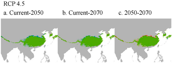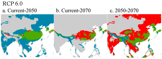 Distribution area of A.davidii in two periods (RCP 4.5). Green area: overlap of area of two different periods (RCP 6.0), blue area: potential range of expansion, and red area: potential range of contraction.