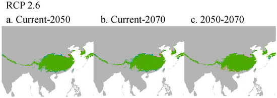 Distribution area of A.davidii in two periods (RCP 2.6). Green area: overlap of area of two different periods (RCP 6.0), blue area: potential range of expansion, and red area: potential range of contraction.