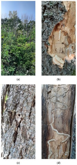 Signs and symptoms of EAB infestation of Fraxinus excelsior trees in Kokinskij Forest of Stupino Forestry near Ozherelie railway station (Kashira District, Moscow Province). (a) Trees with the upper part of main stems dead; (b) larva under the bark; (c) exit hole; (d) larval gallery.